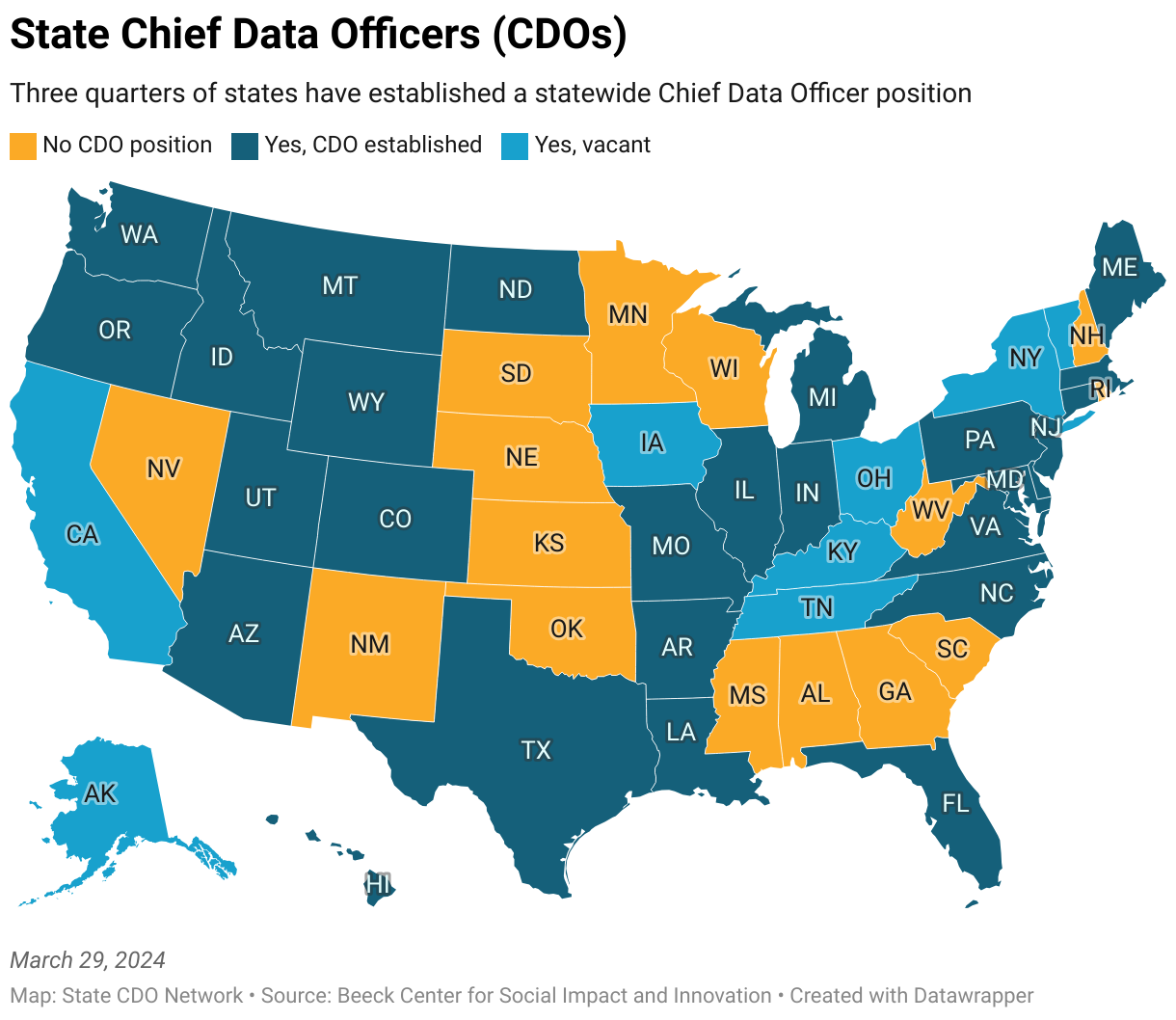 Last week they released an annual report covering their efforts from 2023, and it is, naturally, impressive. It includes a few interesting data-based reports right in the report to show you their efforts. For example, here’s their assessment of which States have Chief Data Officer roles: